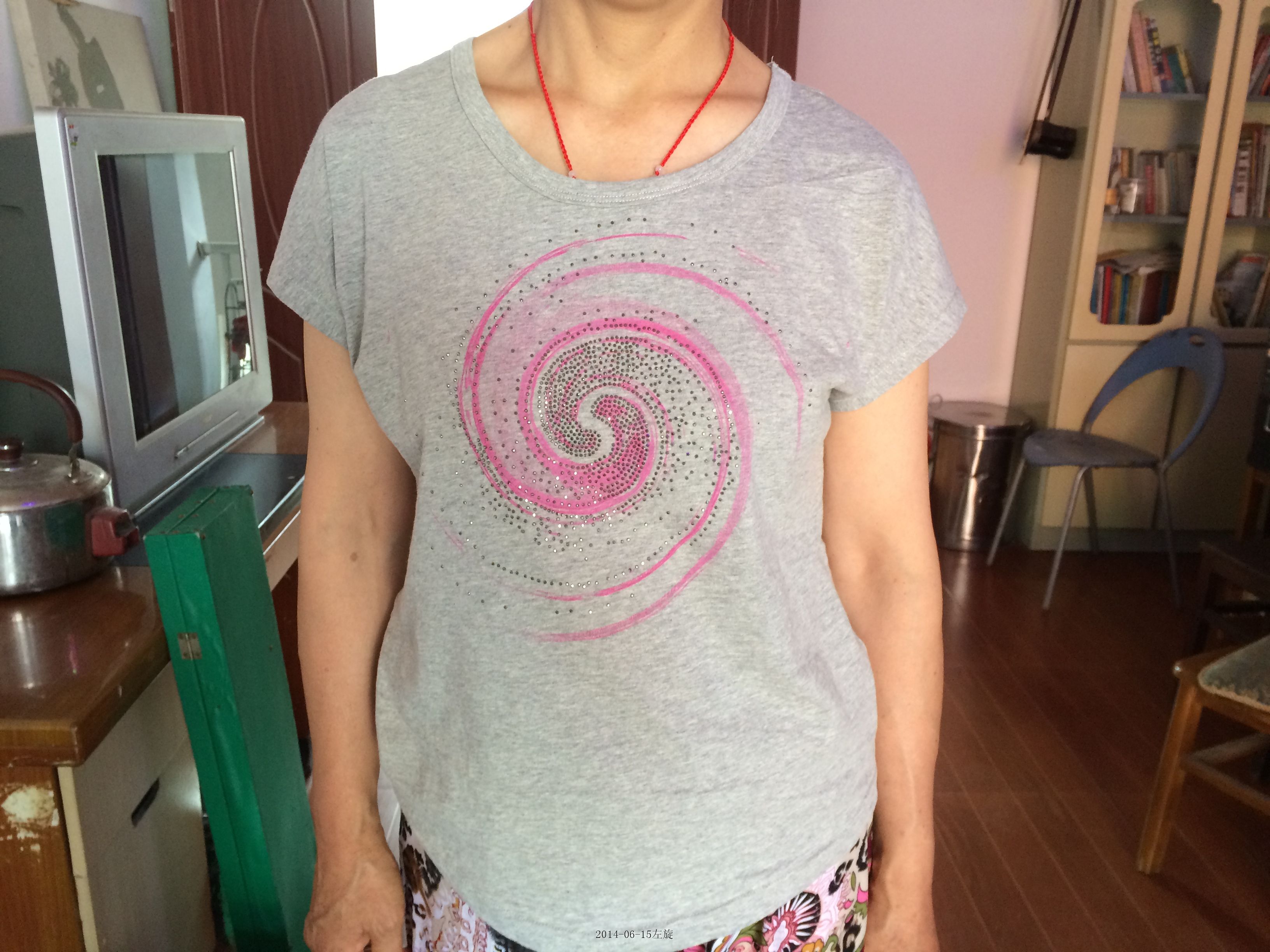 这次上市的T恤是女式的,共两个款色,8个颜色,左旋图案分宝蓝与玫红的,上面还烫钻了,非常漂亮。大小尺寸分为M/L/XL三个。连袖款色为短款,体型丰满的穿着非常合适;插肩袖的款式适合体型比较标准的女士,穿着很得体。我传几张照片给看看吧。