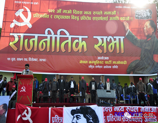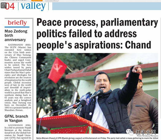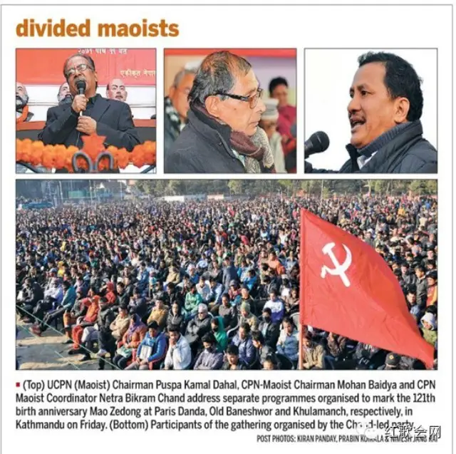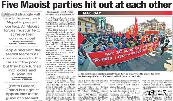(河北经贸大学外语部,河北经贸大学尼泊尔研究中心) 2014年12月26日,尼泊尔共产党毛派各党分别举行集会纪念中国共产党领导人毛泽东主席121周年诞辰。尼泊尔英文报纸《加德满都邮报》(Kathmandu Post)、《喜马拉雅时报》(Himalayan Times)、《共和国报》(Republica)和英语新闻网站尼泊尔新闻网(Nepalnews.com)等尼泊尔媒体予以及时报道。 尼泊尔共产党(毛主义)(Communist Party of Nepal (Maoist),简称尼共(毛),CPN Maoist),曾长期奉行毛泽东武装革命斗争理论, 1996年至2006年发动了长达十年的人民战争。2006年该党参与尼泊尔和平进程,在2008年尼泊尔第一届制宪会议(Constituent Assembly (CA) ,即议会)选举中成为第一大党派, 8月15日尼泊尔共产党(毛主义)主席普拉昌达当选尼泊尔联邦民主共和国首任总理[①]。 现在尼共(毛)已经分裂为五个政党,分别是普拉昌达(Prachanda)[②]领导的“尼泊尔联合共产党(毛主义)” (Unified Communist Party of Nepal (Maoist) ,简称联合尼共(毛)UCPN-Maoist),莫汉·拜迪亚(Mohan Baidhya)领导的“尼泊尔共产党—毛主义”( Communist Party of Nepal-Maoist,简称尼共-毛主义CPN-Maoist)[③],马尼·塔帕(Mani Thapa)领导的“革命共产党”(Revolutionary Communist Party),马提卡·亚达夫(Matrika Yadav)领导的“尼泊尔共产党(毛主义)”(CPN (Maoist)),以及内特拉·比克拉姆·昌德(Netra Bikram Chand)与莫汉·拜迪亚分裂新组建的“尼泊尔共产党毛主义”(简称尼共毛主义,CPN Maoist)[④]。 据尼通社(Rastriya Samatar Samiti,简称RSS,意为国家通讯社 National News Agency )报道,尼泊尔联合共产党(毛主义)发表声明纪念中国共产党领导人毛泽东121诞辰周年,敦促全世界的共产主义者团结起来。这份由该党主席普拉昌达发表的声明表示,毛泽东的革命原则和革命思想是世界人民灵感的源泉。近期所见的世界经济衰退和世界多极化进程中帝国主义的衰败,证明了毛泽东65年前的总结,分析正确,见识卓远[⑤]。