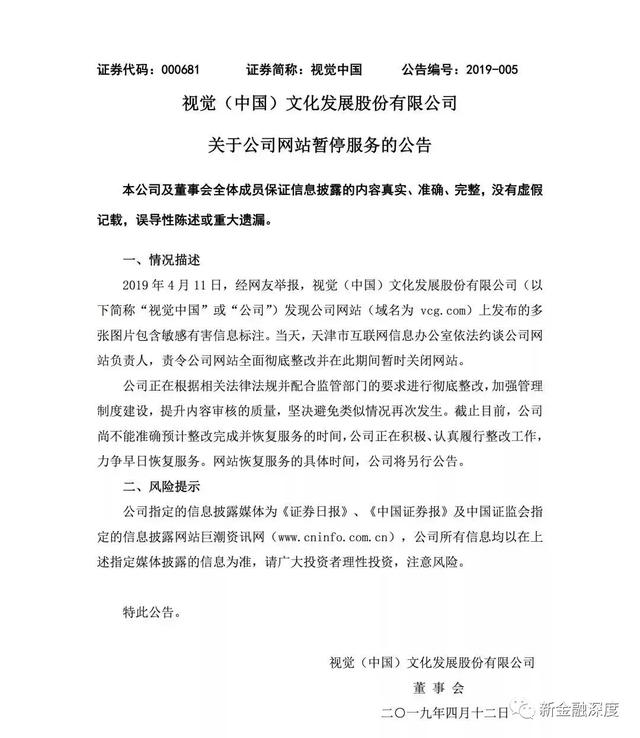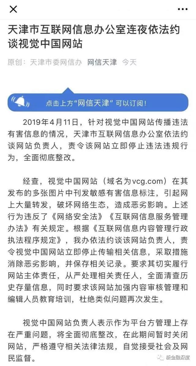 [p=null, 2, left]因一张黑洞照片,视觉中国所积攒的众怒一夜爆发!深夜被天津网信办约谈后,目前视觉中国已关站整改,股价更是一字跌停。下面,新金融头条带您一文看懂视觉中国如何被黑洞“吞噬”。[/p][p=null, 2, left]4月9日晚人类首张黑洞照片公布,在网络上引发转发热潮。4月11日,视觉中国网站上出现了这照片,并注明“此图片是编辑图片,如用于商业用途,请致电400-818-2525或咨询客服代表。“[/p][p=null, 2, left][/p][p=null, 2, left]这一动作迅速引起外界关注,有网友戏称:“视觉中国准备靠黑洞照片大捞一笔。”[/p][p=null, 2, left]事件迅速发酵。网友扒出,视觉中国网站上存在大量国旗国徽等图片,亦归属于视觉中国版权,需要付费购买。对此,共青团中央微博4月11日怒怼:国旗、国徽的版权也是贵公司的?直指其版权不合理售卖问题。[/p][p=null, 2, left]随后视觉中国将图片说明改成了“此图片是编辑类图片,不得用于商业用途”,并将来源标明为欧洲南方天文台(The European Southern Observatory,简称ESO),但此事还是迅速引发了激烈的舆论讨论,不少人质疑视觉中国将一幅公开发布的照片列为自有版权,如要使用则需要向视觉中国支付费用的做法是否合理合法。[/p][p=null, 2, left]当日,16点26分,视觉中国官方微博发布第一次致歉声明,经网友举报的视觉中国网站关于国旗、国徽等不合规图片,经查该图片由视觉中国签约供稿人提供,视觉中国作为平台方负有审核不严的责任,为此深表歉意!已对不合规图片做了下线处理,并将根据相关法律法规持续性的加强审核,避免类似情况发生。[/p][p=null, 2, left]不仅是共青团,11日晚间,新华社、人民日报分别点名视觉中国。新华社质疑了黑洞照片的版权归属问题,并提及视觉中国上国旗、国徽等照片的商用行为。人民日报则直言道,“没有人否认摄影作品有著作权。问题在于,著作权是否成立?平台有没有净化版权池?商业模式是否经得起推敲?”质问视觉中国核心商业模式问题。[/p][p=null, 2, left]4月11日晚8时许,有网友发现视觉中国网站已经无法打开。[/p][p=null, 2, left][/p][p=null, 2, left]4月12日凌晨,微信公众号“网信天津”发布消息称,4月11日,针对视觉中国网站传播违法有害信息的情况,天津市互联网信息办公室连夜依法约谈网站负责人,责令该网站立即停止违法违规行为,全面彻底整改。[/p][p=null, 2, left]经查,视觉中国网站(域名为vcg.com)在其发布的多张图片中刊发敏感有害信息标注,引起网上大量转发,破坏网络生态,造成恶劣影响。上述行为违反了《网络安全法》《互联网信息服务管理办法》有关规定。根据《互联网信息内容管理行政执法程序规定》,天津市网信办依法约谈该网站负责人,责令视觉中国网站立即停止传输相关信息,采取措施消除恶劣影响,并保存相关记录。要求其切实履行网站主体责任,从严处理相关责任人,全面清查历史存量信息,同时要求该网站加强内容审核管理和编辑人员教育培训,杜绝类似问题再次发生。[/p][p=null, 2, left]视觉中国网站负责人表示作为平台方管理上存在严重问题,将全面彻底整改,在此期间暂时关闭网站,严格遵守相关法律法规,自觉接受社会及网民监督。[/p][p=null, 2, left][/p][p=null, 2, left]随后凌晨3时许,视觉中国在官方微博致歉:目前,公司已采取措施对不合规图片全部下线处理,并根据相关法律法规自愿关闭网站开展整改,进一步强化企业自律,强化制度建设,提升内容审核的质量,避免类似情况再次发生。[/p][p=null, 2, left][/p][p=null, 2, left]4月12日8时,据《每日经济新闻》最新消息,ESO在回复《每日经济新闻》采访请求时明确表示,视觉中国的这种版权主张不合法,ESO从未,也不能将他们的图片版权转让给任何其他个人或组织,且视觉中国从未就黑洞图片联系过ESO,至少到目前为止没有任何自称是视觉中国代表的人联系过ESO。[/p][p=null, 2, left]4月12日早间,视觉中国公告,4月11日,公司发现公司网站(域名为vcg.com)上发布的多张图片包含敏感有害信息标注。当天,天津市互联网信息办公室依法约谈公司网站负责人,责令公司网站全面彻底整改并在此期间暂时关闭网站。公司正在根据相关法律法规并配合监管部门的要求进行彻底整改,加强管理制度建设,提升内容审核的质量,坚决避免类似情况再次发生。截至目前,公司尚不能准确预计整改完成并恢复服务的时间,公司正在积极、认真履行整改工作,力争早日恢复服务。网站恢复服务的具体时间,公司将另行公告。[/p][p=null, 2, left][/p][p=null, 2, left]值得注意的是,公开信息显示,视觉中国4月12日将有3.88亿股限售股上市流通,占公司总股本比例的55.39%。以今日收盘价28元/股算,解禁市值逾百亿元。[/p][p=null, 2, left]此次解禁是五年前视觉中国借壳远东股份所定向增发的股份,当时定增发行价为5.28元/股,五年期间未实施过股份送转,全部为自然人股东限售股解禁。[/p][p=null, 2, left]新金融头条看到,今日开盘后,视觉中国无悬念跌停,报25.20元/股。封单达40余万手。[/p][p=null, 2, left][/p][p=null, 2, left]4月12日10时许,国家版权网站发布公告称,近日,“黑洞图片”版权问题引发关注。国家版权局重视图片版权保护,依法维护著作权人合法权益。各图片公司要健全版权管理机制,规范版权运营,合法合理维权,不得滥用权利。国家版权局将把图片版权保护纳入即将开展的“剑网2019”专项行动,进一步规范图